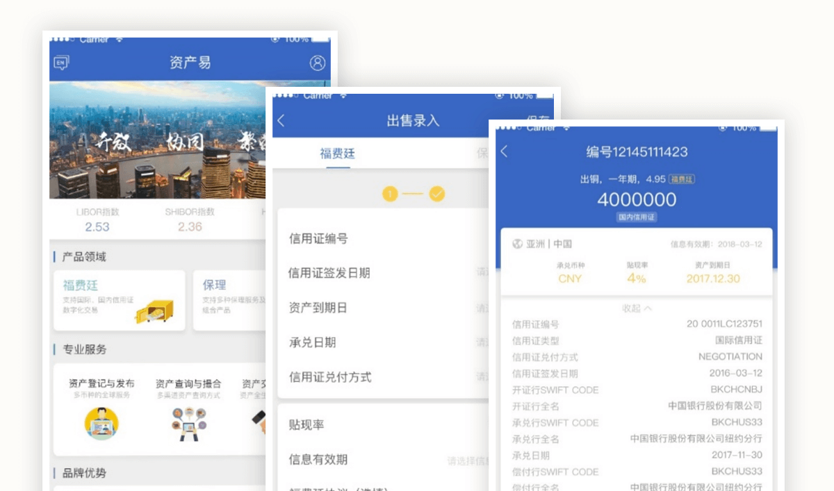 资产易是一个国际化的数字交易平台,主要交易多种类型和多币种金融资产,包括福费廷和保理资产。平台支持PC、IOS、Android终端。