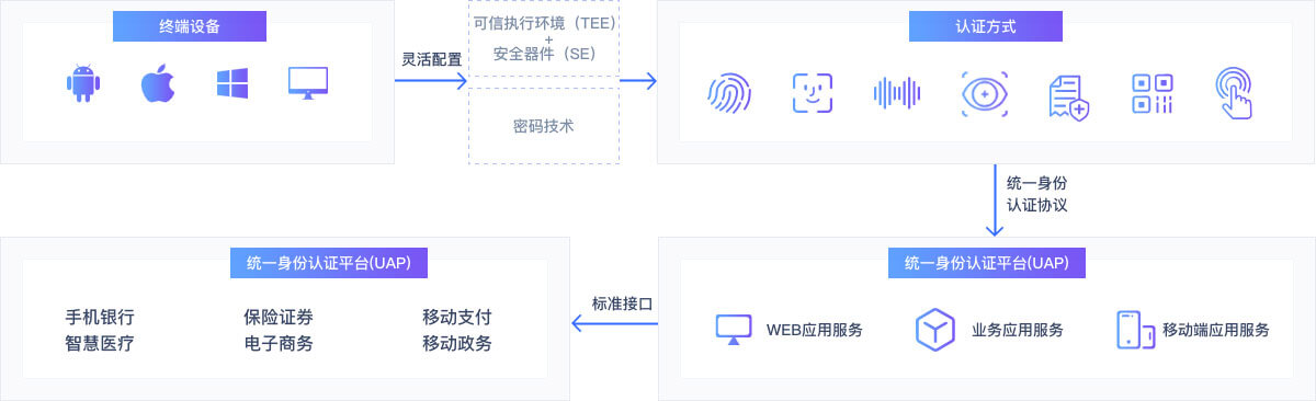 统一身份认证平台——以先进的FIDO身份认证协议为基础,通过统一用户身份管理、规范化认证服务接口、快捷接入各类认证技术等全面的标准化架构能力,支持多渠道应用的快速接入,构建数字化进程中的身份认证产业生态。