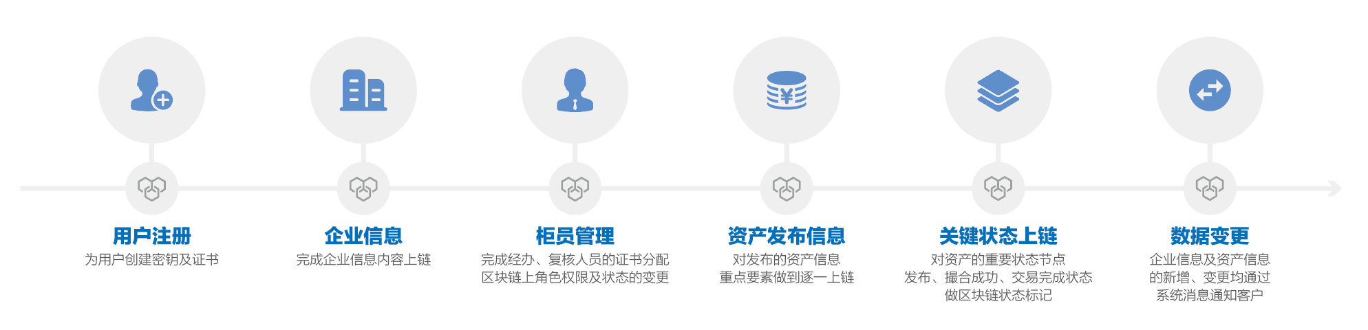 基于区块链技术、智能识别技术、可信身份认证技术构建的金融数字资产交易平台,实现福费廷、保理等金融资产的数字化、证券化。通过该平台实现线上资产发布、撮合及交易确认。与中国建设银行总行合作,实现国内首笔基于区块链技术的福费廷资产跨境交易落地,实现资产交易的线上化。